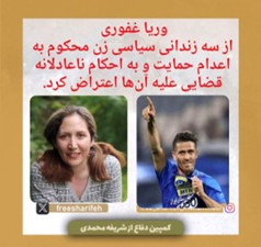 ادامه متن ...وریا غفوری، کاپیتان پیشین تیم فوتبال استقلال روز جمعه، ۳۱ مرداد با انتشار استوری در صفحه اینستاگرام خود از پخشان عزیزی، شریفه محمدی و وریشه مرادی، سه زندانی سیاسی زن محکوم به اعدام حمایت و به احکام ناعادلانه قضایی علیه آنها اعتراض کرد. این سه فعال مدنی و سیاسی که به اتهام “بغی” (قیام مسلحانه علیه نظام) در دستگاه قضایی …